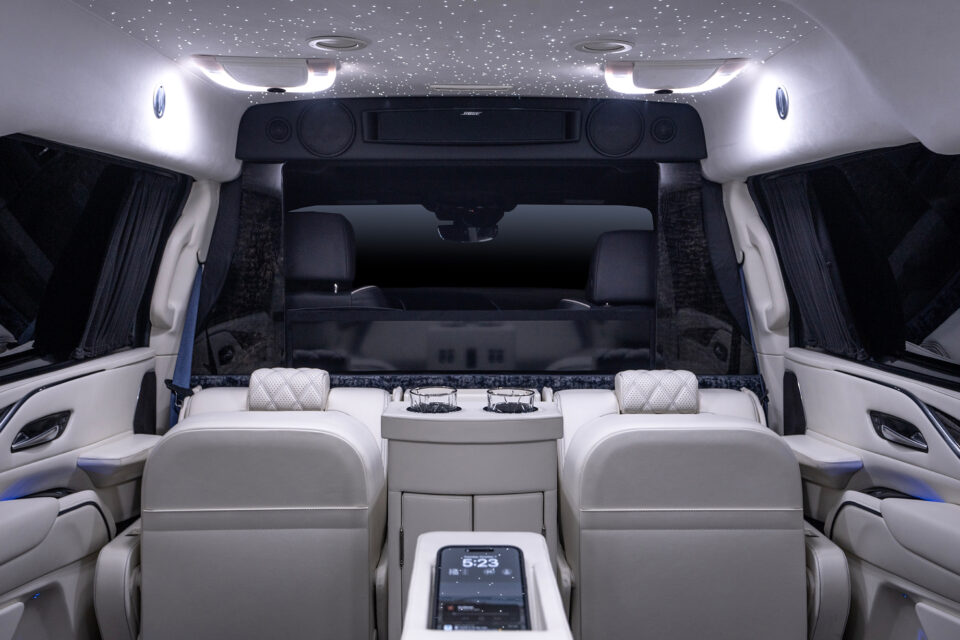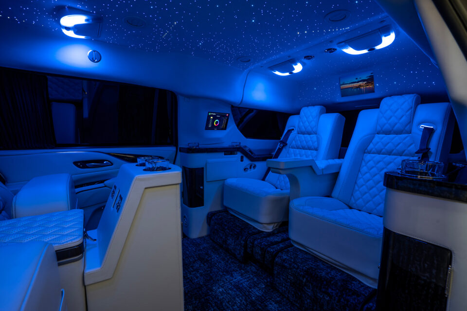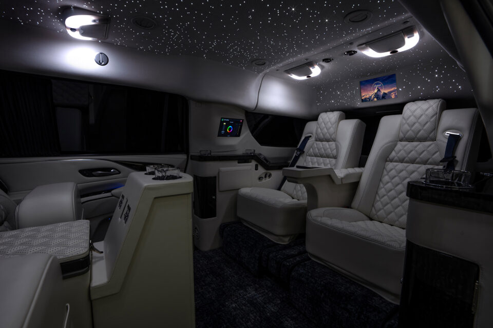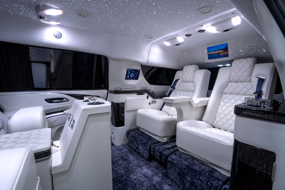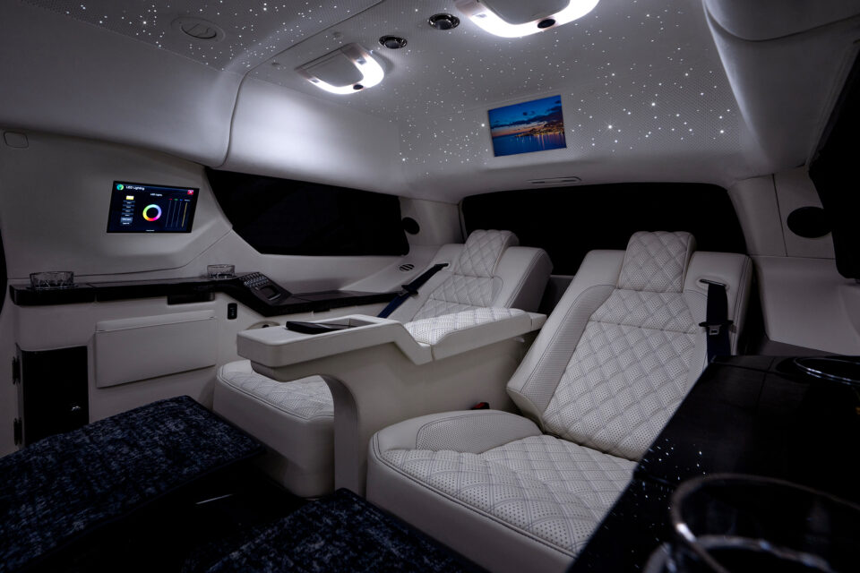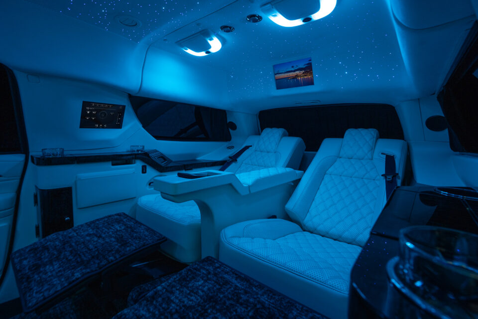 Interior rear cabin seating for 4 VIP passengers. Custom handpicked interior European leathers, headliner, carpet and genuine wood veneer. Enhanced by beautiful aviation LED lighting. Includes two custom aviation style folding tables with forward and backward adjustability. Storage for pull out Nespresso coffee machine, top loading refrigerator, glassware and bottle storage, trash and more storage. Two large 4K LCD screens for forward and backward facing passengers, Apple TV coupled with a Bose sound bar surround sound system. Includes a high-end sophisticated on-board router for superior internet connectivity. Please contact us for additional Information.