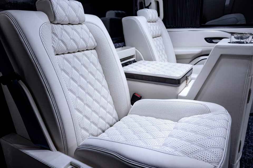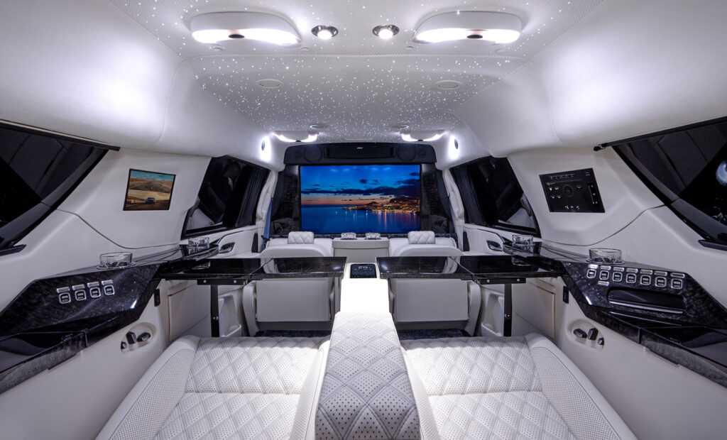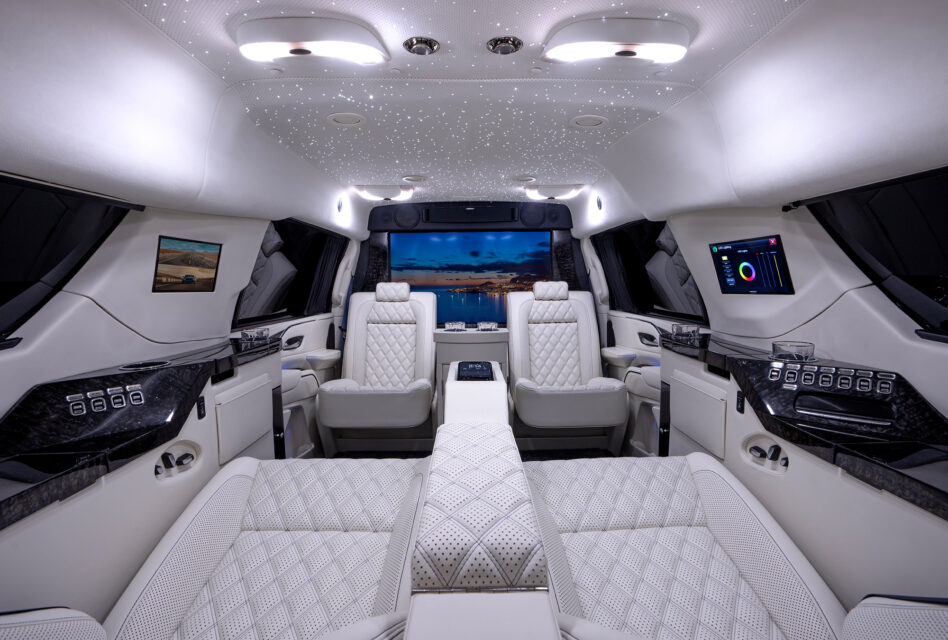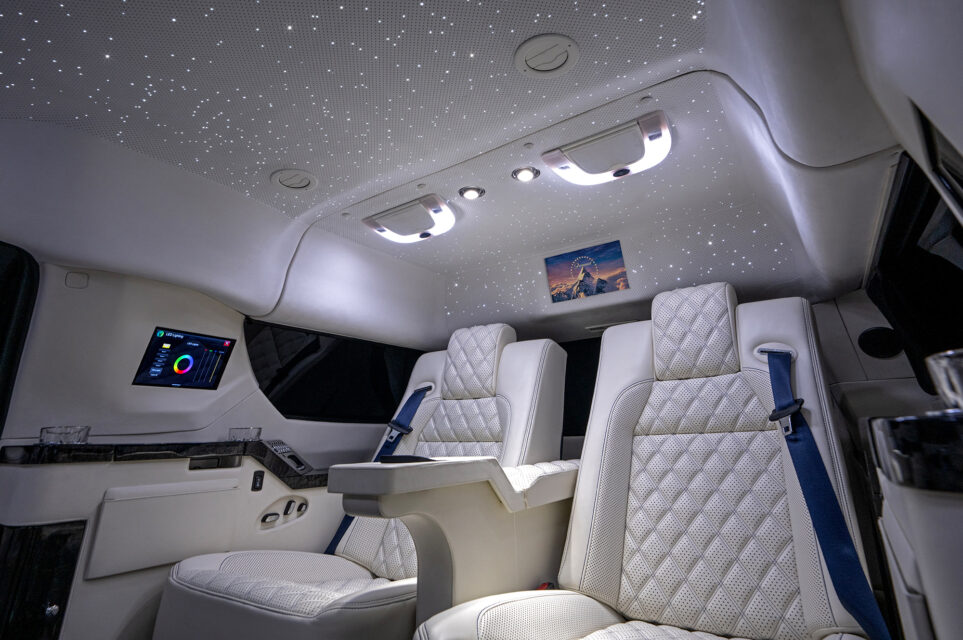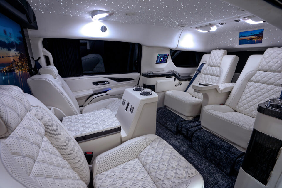 Interior rear cabin seating for 4 VIP passengers. Custom handpicked interior European leathers, headliner, carpet and genuine wood veneer. Enhanced by beautiful aviation LED lighting. Includes two custom aviation style folding tables with forward and backward adjustability. Storage for pull out Nespresso coffee machine, top loading refrigerator, glassware and bottle storage, trash and more storage. Two large 4K LCD screens for forward and backward facing passengers, Apple TV coupled with a Bose sound bar surround sound system. Includes a high-end sophisticated on-board router for superior internet connectivity. Please contact us for additional Information.