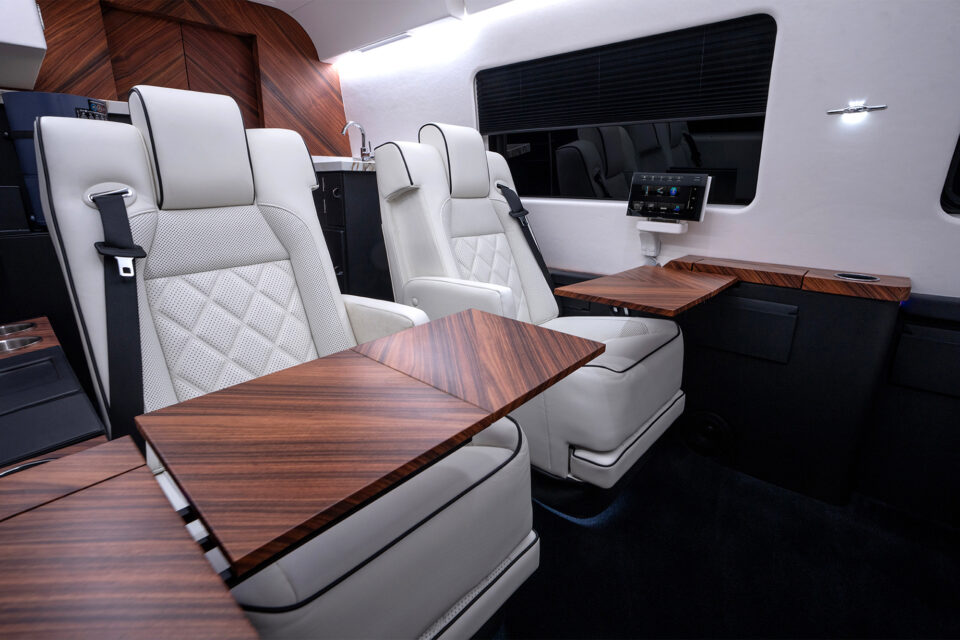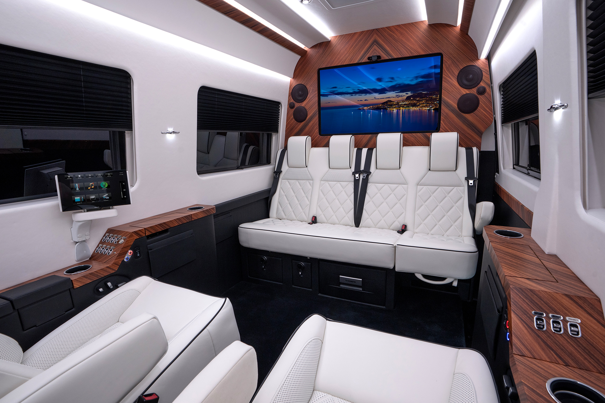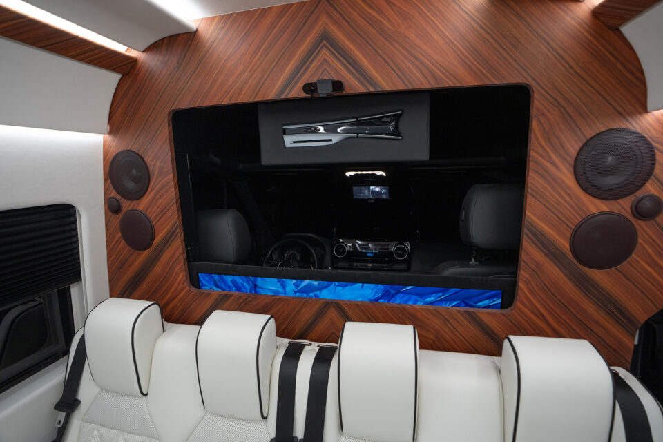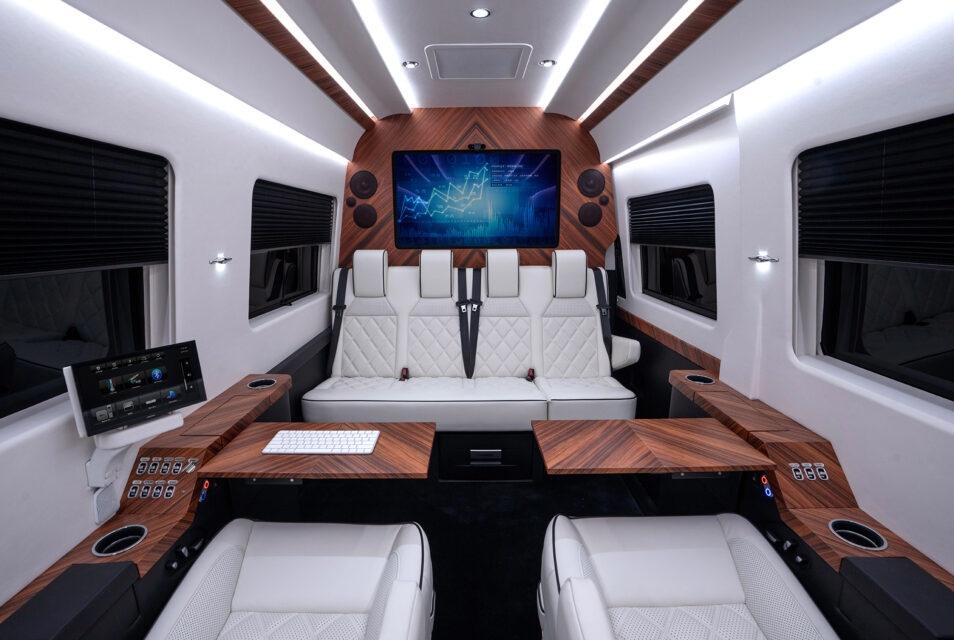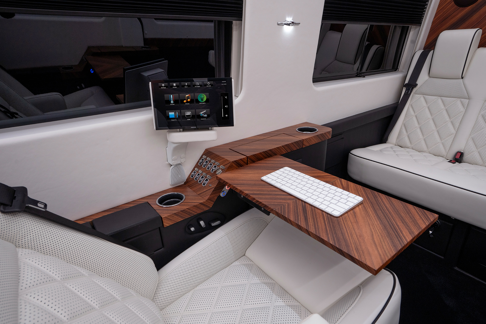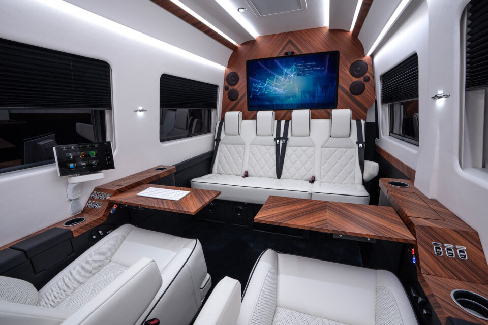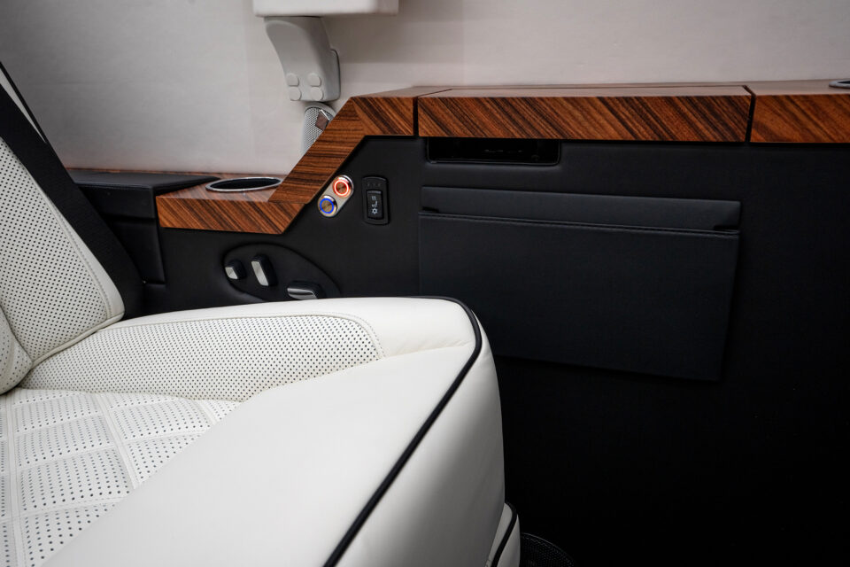 Rare opportunity! 2022 Stretched Becker Cadillac Escalade ESV. 20″ stretch with 10″ lengthened rear doors. An elegant dark navy blue imported Italian diamond stitched leather coupled with rich hand crafted genuine burl wood veneer finish throughout. Includes custom Becker VIP 6 way electric bucket seats with one touch electric leg extensions, two aviation style folding work tables, center console with wireless cell charging and storage compartment. Two fully electric full size rear facing bucket seats with built in 3 point seatbelts and electric adjustable headrests. A rear facing center console with a large top loading refrigerator. A large 43″ LCD screen that is mounted on a fully-electric center divider partition for easy viewing through the front windshield. The Bose surround sound system and Apple TV is controlled through an Apple iPad with Crestron app for an intuitive easy to use AV switching system. Mobile office capabilities include a high-end 5G on-board mobile router with additional roof mounted antennas to assure a solid internet connection. $425k when new.