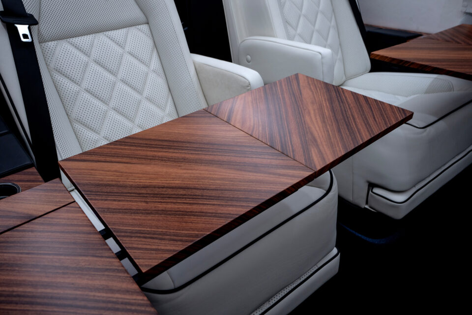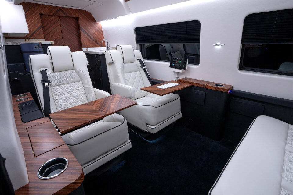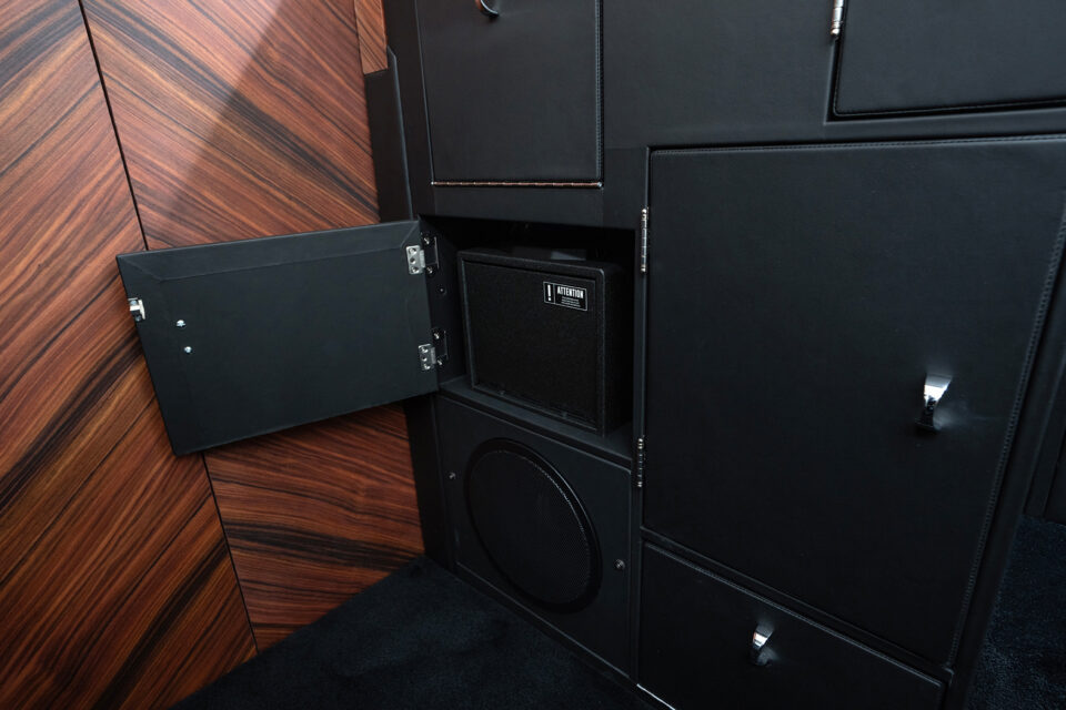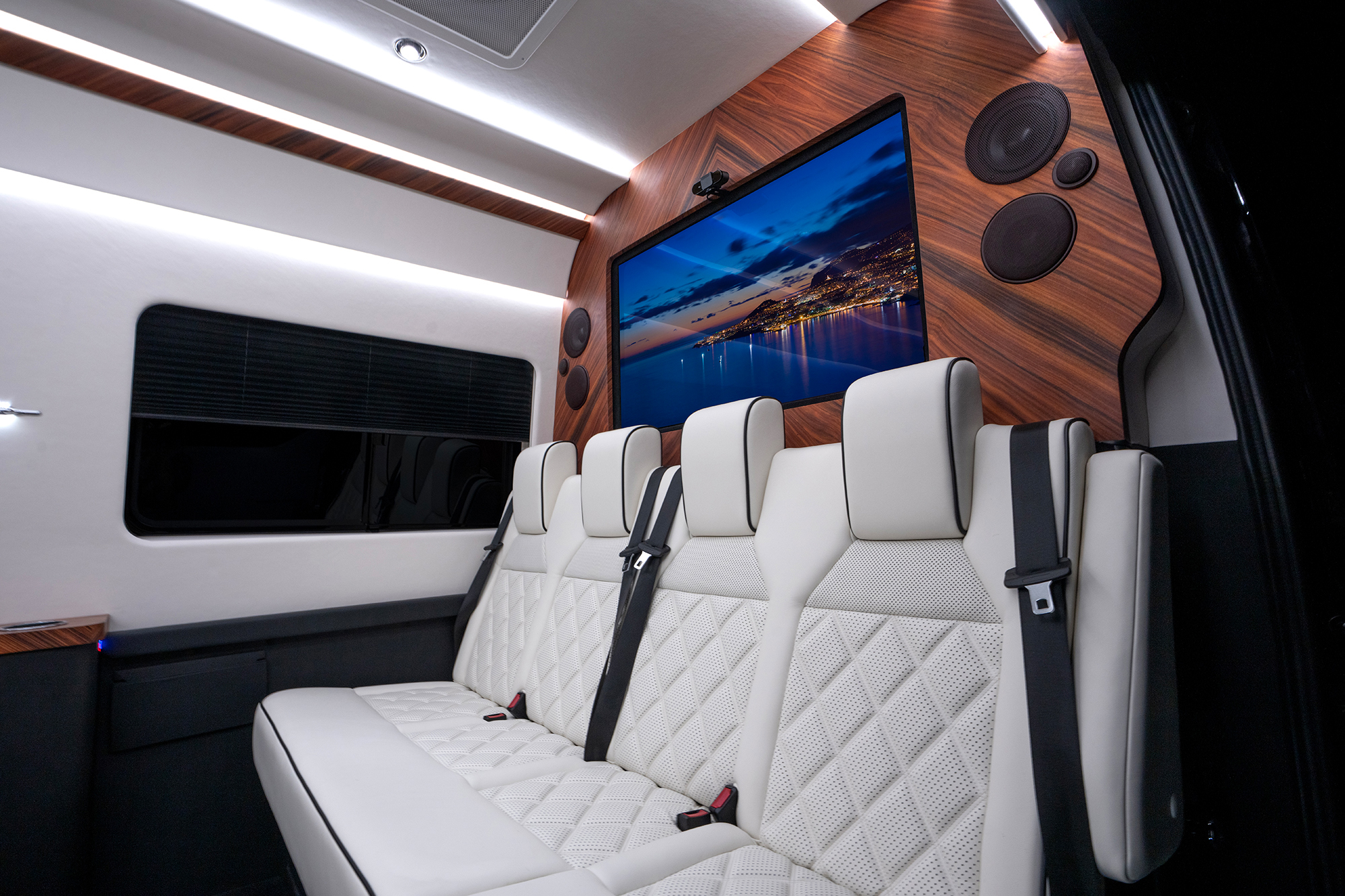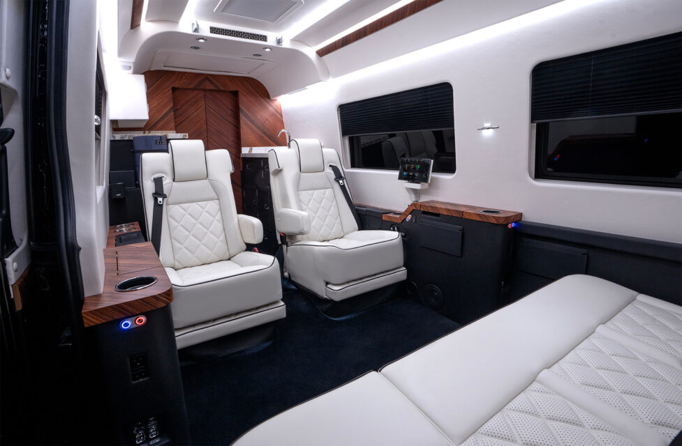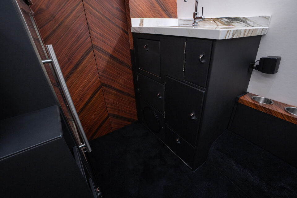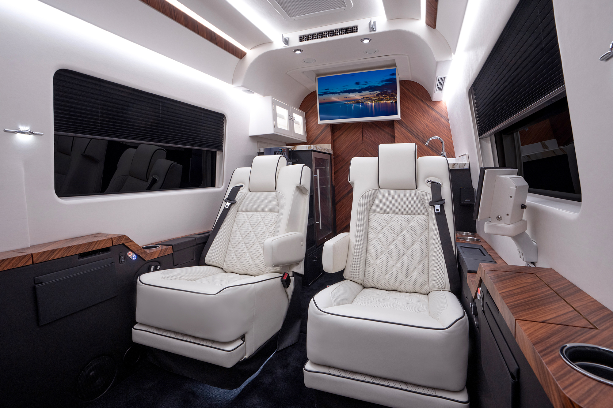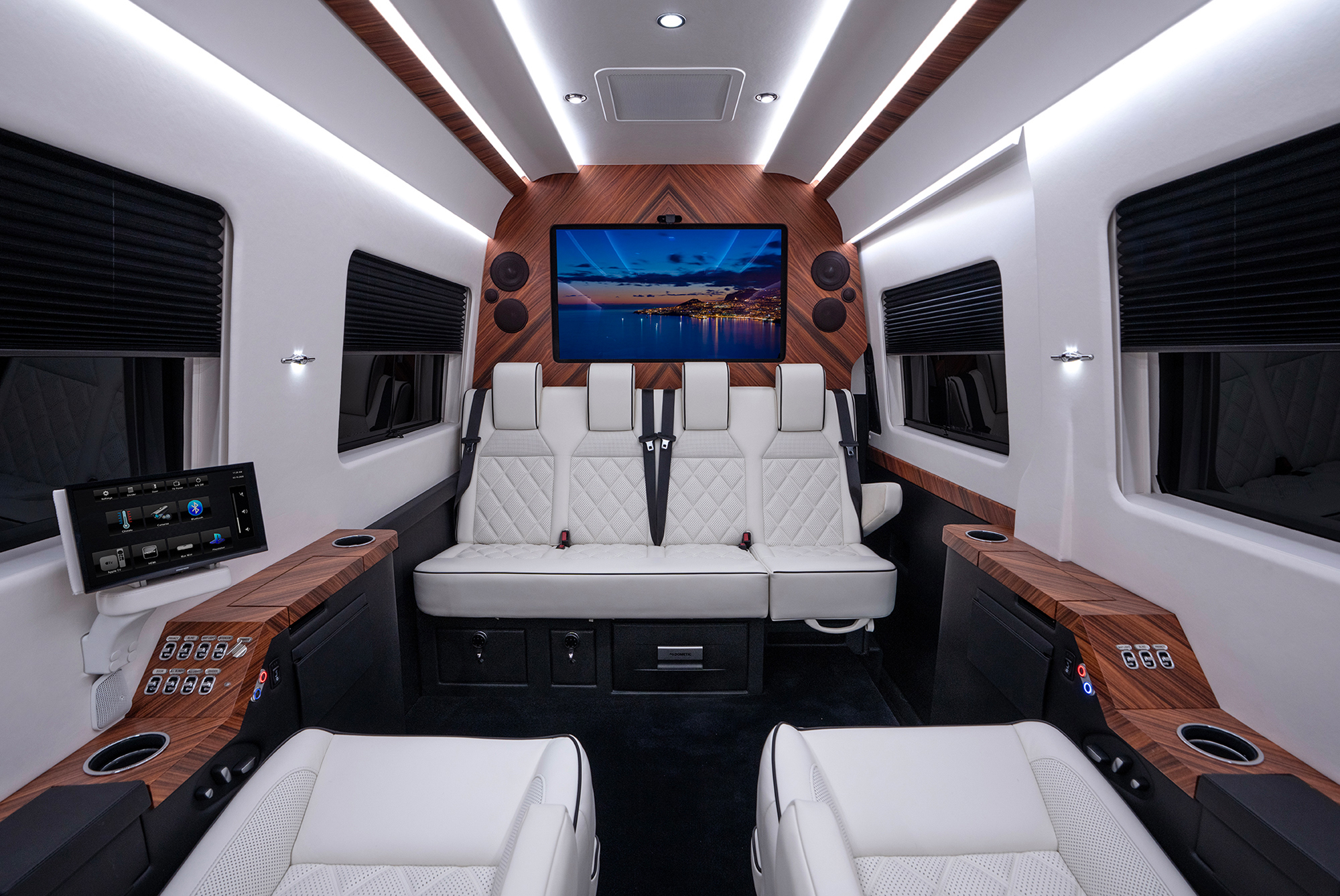Rare opportunity! 2022 Stretched Becker Cadillac Escalade ESV. 20″ stretch with 10″ lengthened rear doors. An elegant dark navy blue imported Italian diamond stitched leather coupled with rich hand crafted genuine burl wood veneer finish throughout. Includes custom Becker VIP 6 way electric bucket seats with one touch electric leg extensions, two aviation style folding work tables, center console with wireless cell charging and storage compartment. Two fully electric full size rear facing bucket seats with built in 3 point seatbelts and electric adjustable headrests. A rear facing center console with a large top loading refrigerator. A large 43″ LCD screen that is mounted on a fully-electric center divider partition for easy viewing through the front windshield. The Bose surround sound system and Apple TV is controlled through an Apple iPad with Crestron app for an intuitive easy to use AV switching system. Mobile office capabilities include a high-end 5G on-board mobile router with additional roof mounted antennas to assure a solid internet connection. $425k when new.