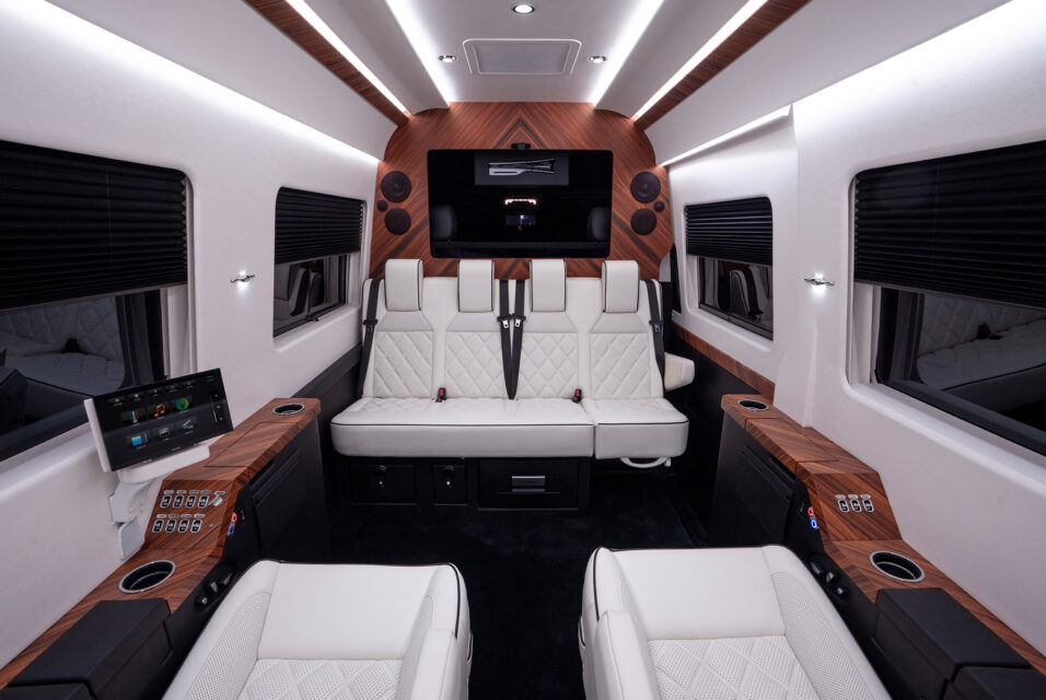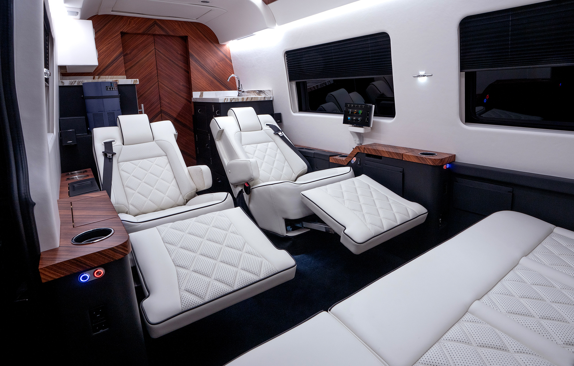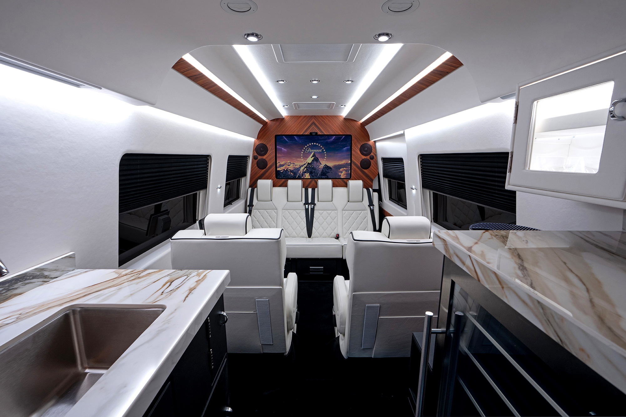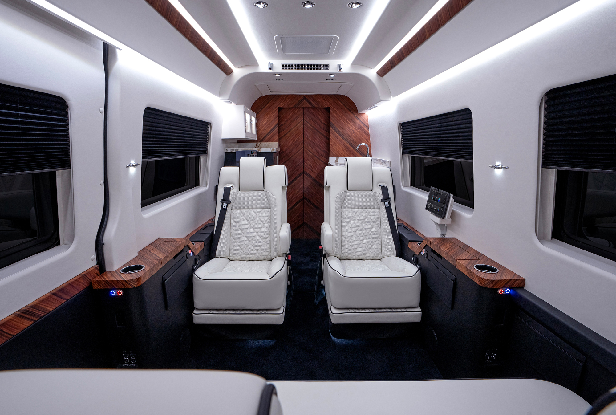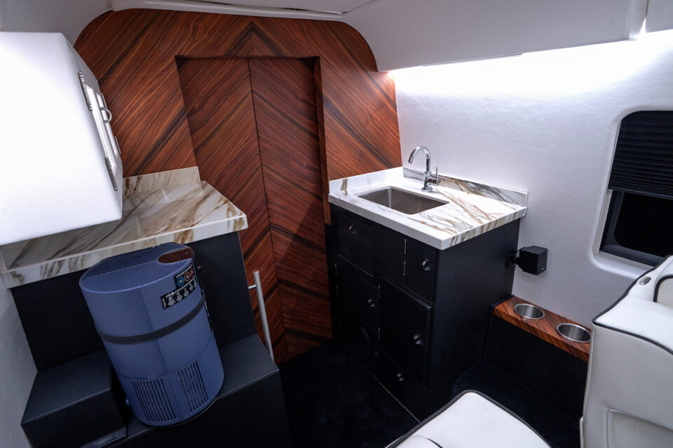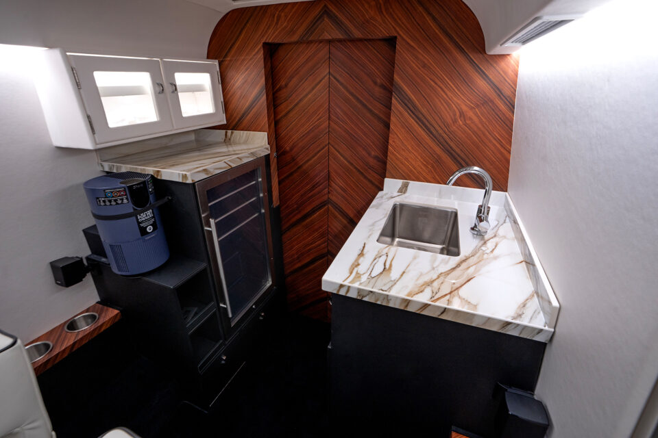 Rare opportunity! 2022 Stretched Becker Cadillac Escalade ESV. 20″ stretch with 10″ lengthened rear doors. An elegant dark navy blue imported Italian diamond stitched leather coupled with rich hand crafted genuine burl wood veneer finish throughout. Includes custom Becker VIP 6 way electric bucket seats with one touch electric leg extensions, two aviation style folding work tables, center console with wireless cell charging and storage compartment. Two fully electric full size rear facing bucket seats with built in 3 point seatbelts and electric adjustable headrests. A rear facing center console with a large top loading refrigerator. A large 43″ LCD screen that is mounted on a fully-electric center divider partition for easy viewing through the front windshield. The Bose surround sound system and Apple TV is controlled through an Apple iPad with Crestron app for an intuitive easy to use AV switching system. Mobile office capabilities include a high-end 5G on-board mobile router with additional roof mounted antennas to assure a solid internet connection. $425k when new.