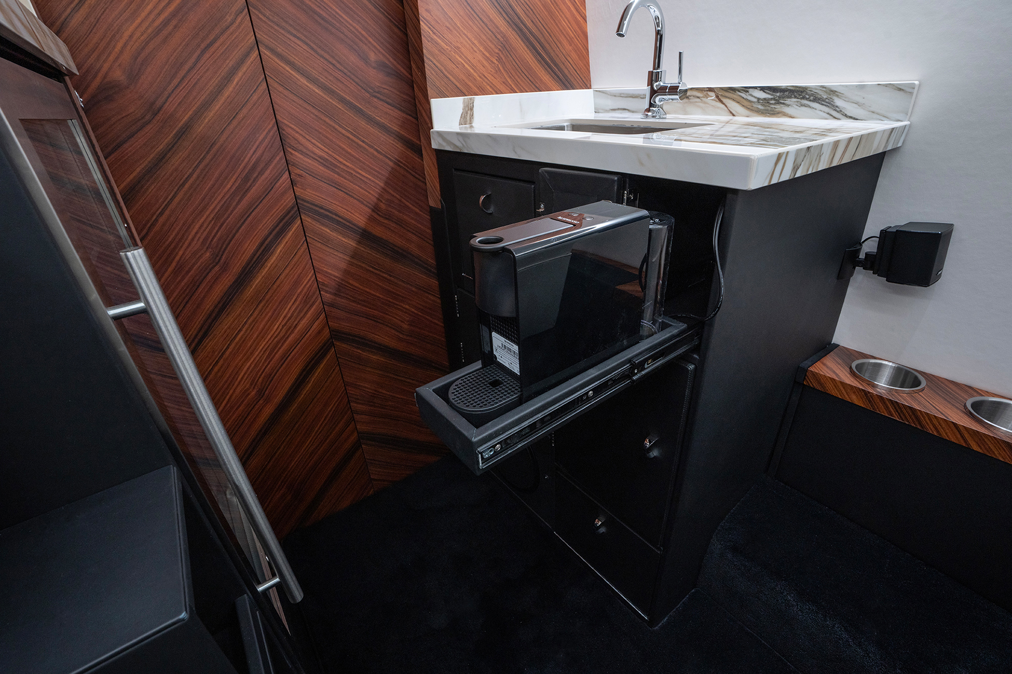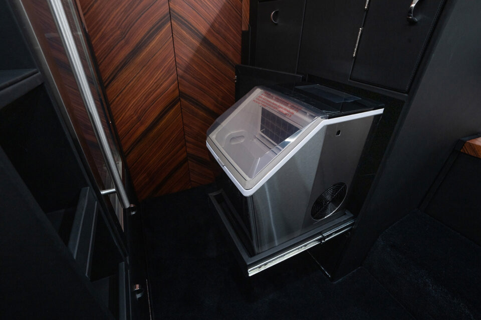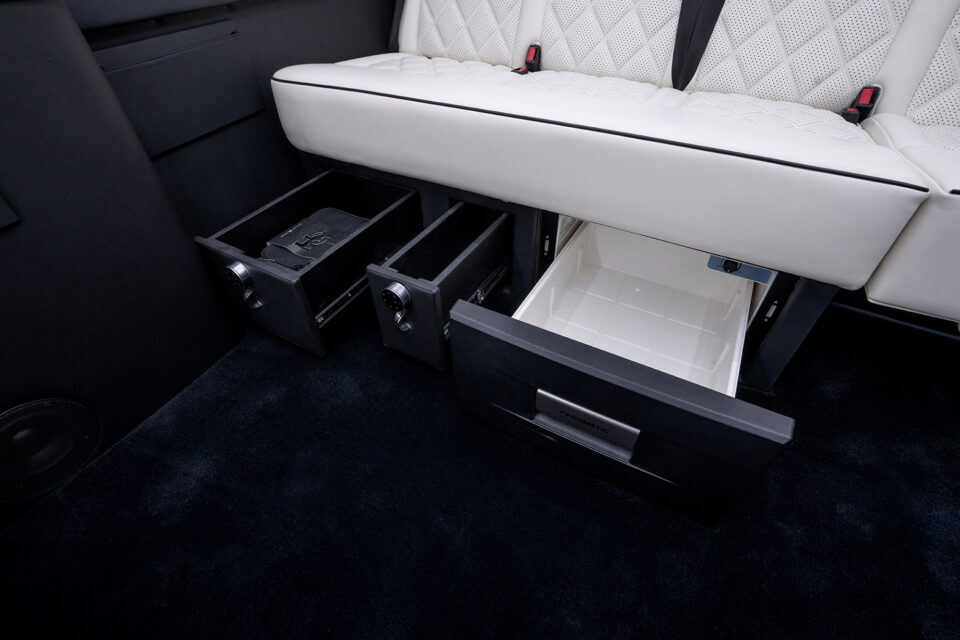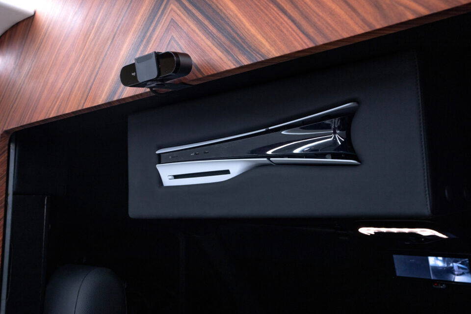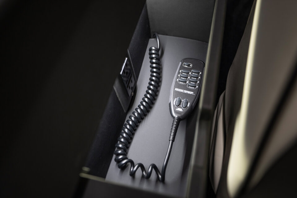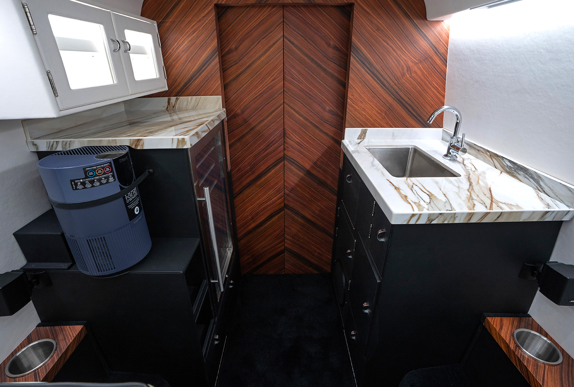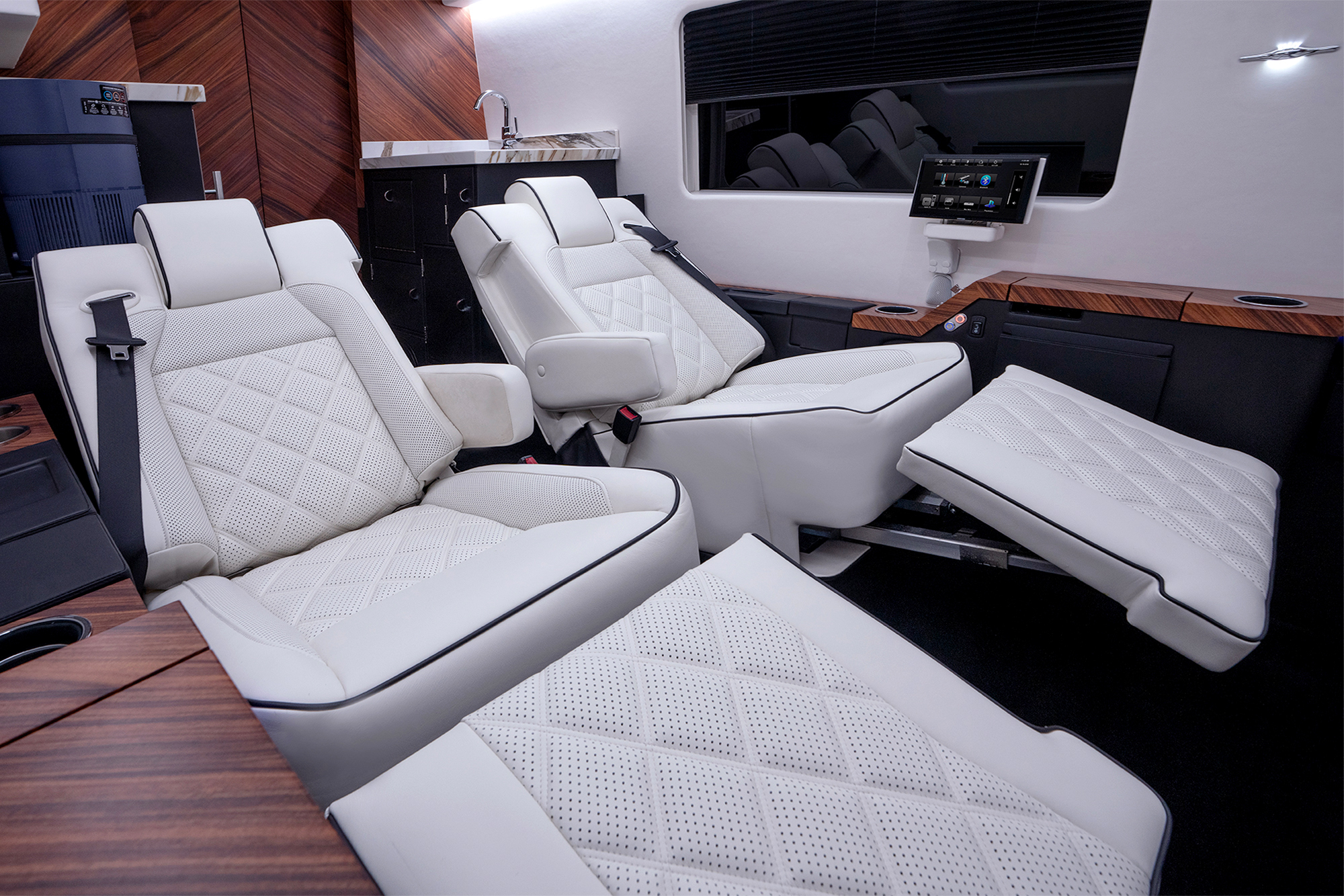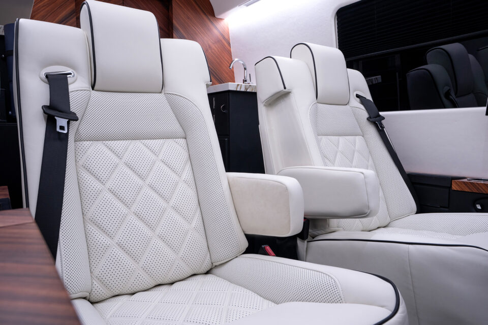 Rare opportunity! 2022 Stretched Becker Cadillac Escalade ESV. 20″ stretch with 10″ lengthened rear doors. An elegant dark navy blue imported Italian diamond stitched leather coupled with rich hand crafted genuine burl wood veneer finish throughout. Includes custom Becker VIP 6 way electric bucket seats with one touch electric leg extensions, two aviation style folding work tables, center console with wireless cell charging and storage compartment. Two fully electric full size rear facing bucket seats with built in 3 point seatbelts and electric adjustable headrests. A rear facing center console with a large top loading refrigerator. A large 43″ LCD screen that is mounted on a fully-electric center divider partition for easy viewing through the front windshield. The Bose surround sound system and Apple TV is controlled through an Apple iPad with Crestron app for an intuitive easy to use AV switching system. Mobile office capabilities include a high-end 5G on-board mobile router with additional roof mounted antennas to assure a solid internet connection. $425k when new.