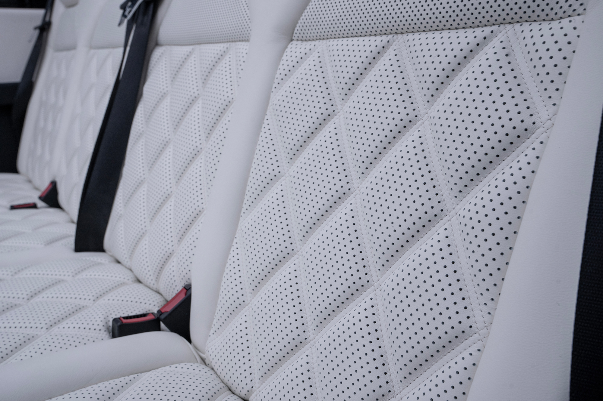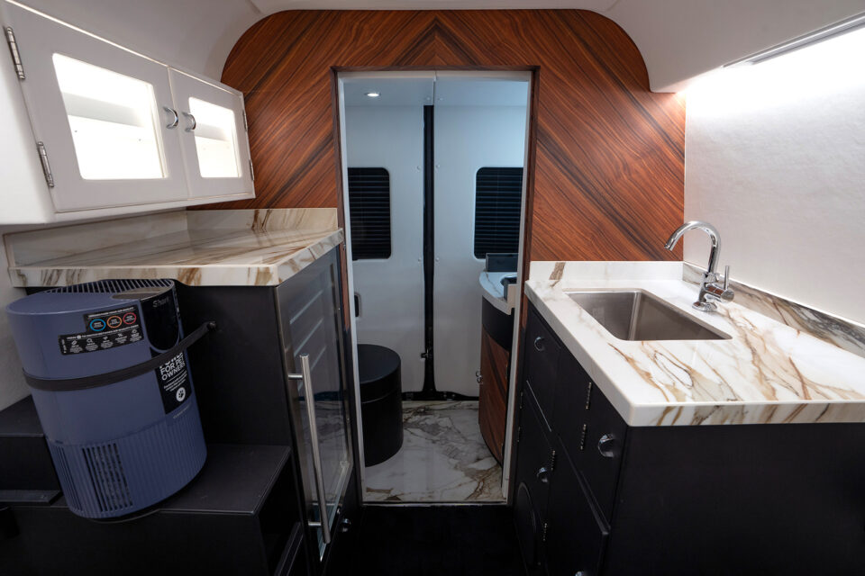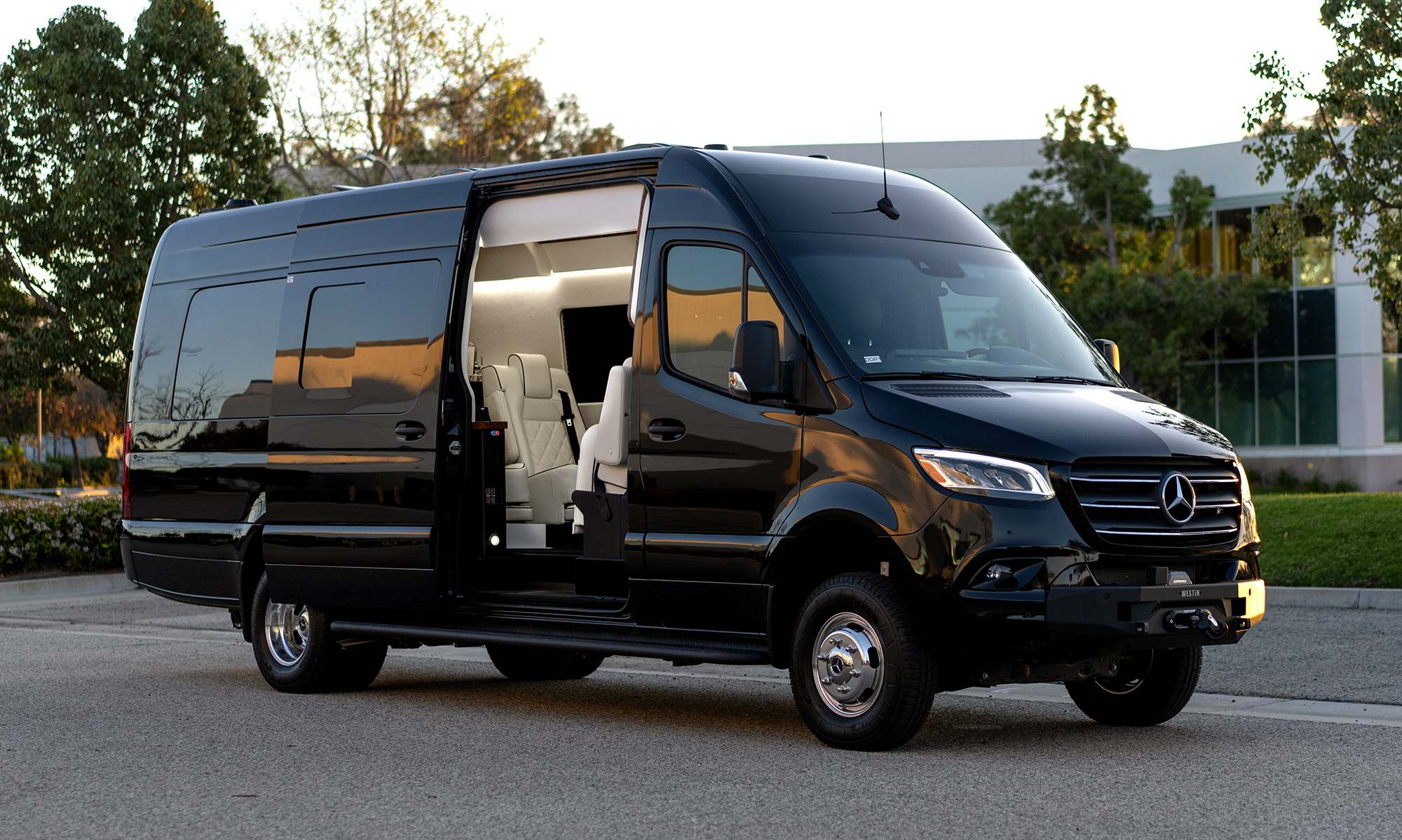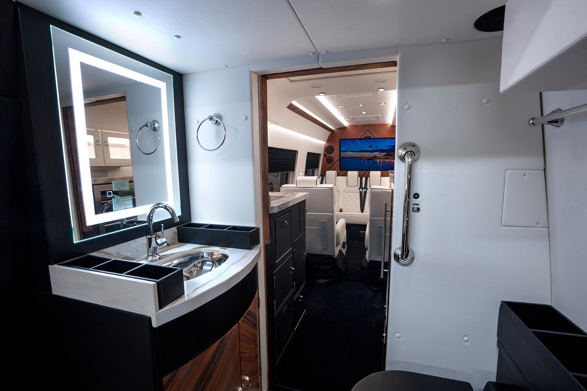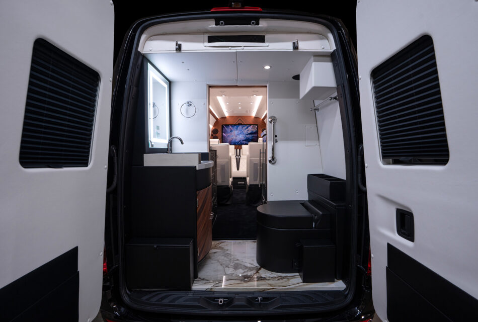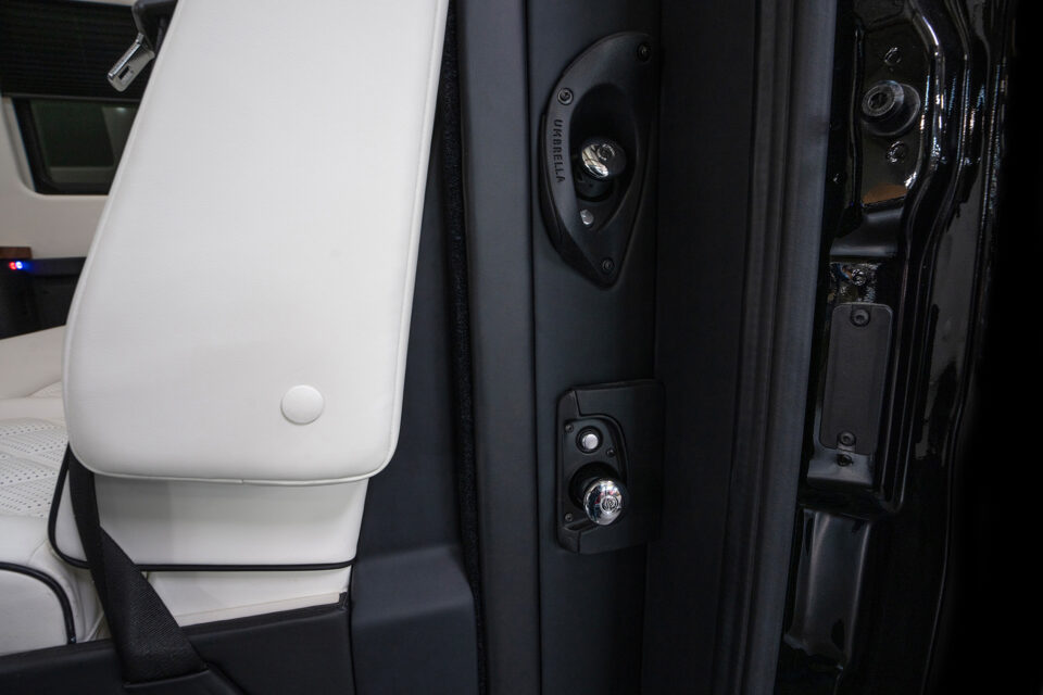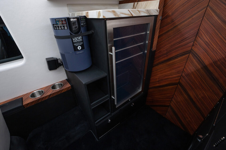 Rare opportunity! 2022 Stretched Becker Cadillac Escalade ESV. 20″ stretch with 10″ lengthened rear doors. An elegant dark navy blue imported Italian diamond stitched leather coupled with rich hand crafted genuine burl wood veneer finish throughout. Includes custom Becker VIP 6 way electric bucket seats with one touch electric leg extensions, two aviation style folding work tables, center console with wireless cell charging and storage compartment. Two fully electric full size rear facing bucket seats with built in 3 point seatbelts and electric adjustable headrests. A rear facing center console with a large top loading refrigerator. A large 43″ LCD screen that is mounted on a fully-electric center divider partition for easy viewing through the front windshield. The Bose surround sound system and Apple TV is controlled through an Apple iPad with Crestron app for an intuitive easy to use AV switching system. Mobile office capabilities include a high-end 5G on-board mobile router with additional roof mounted antennas to assure a solid internet connection. $425k when new.
