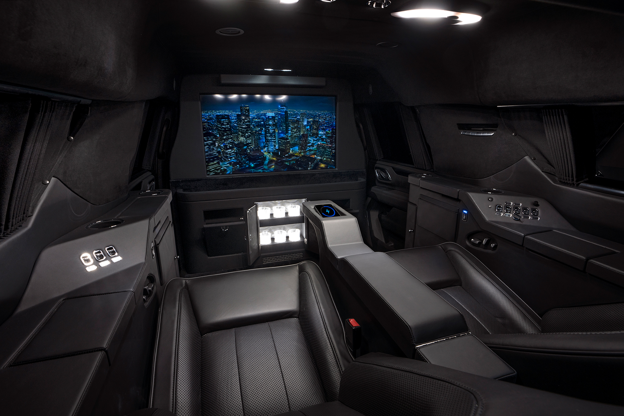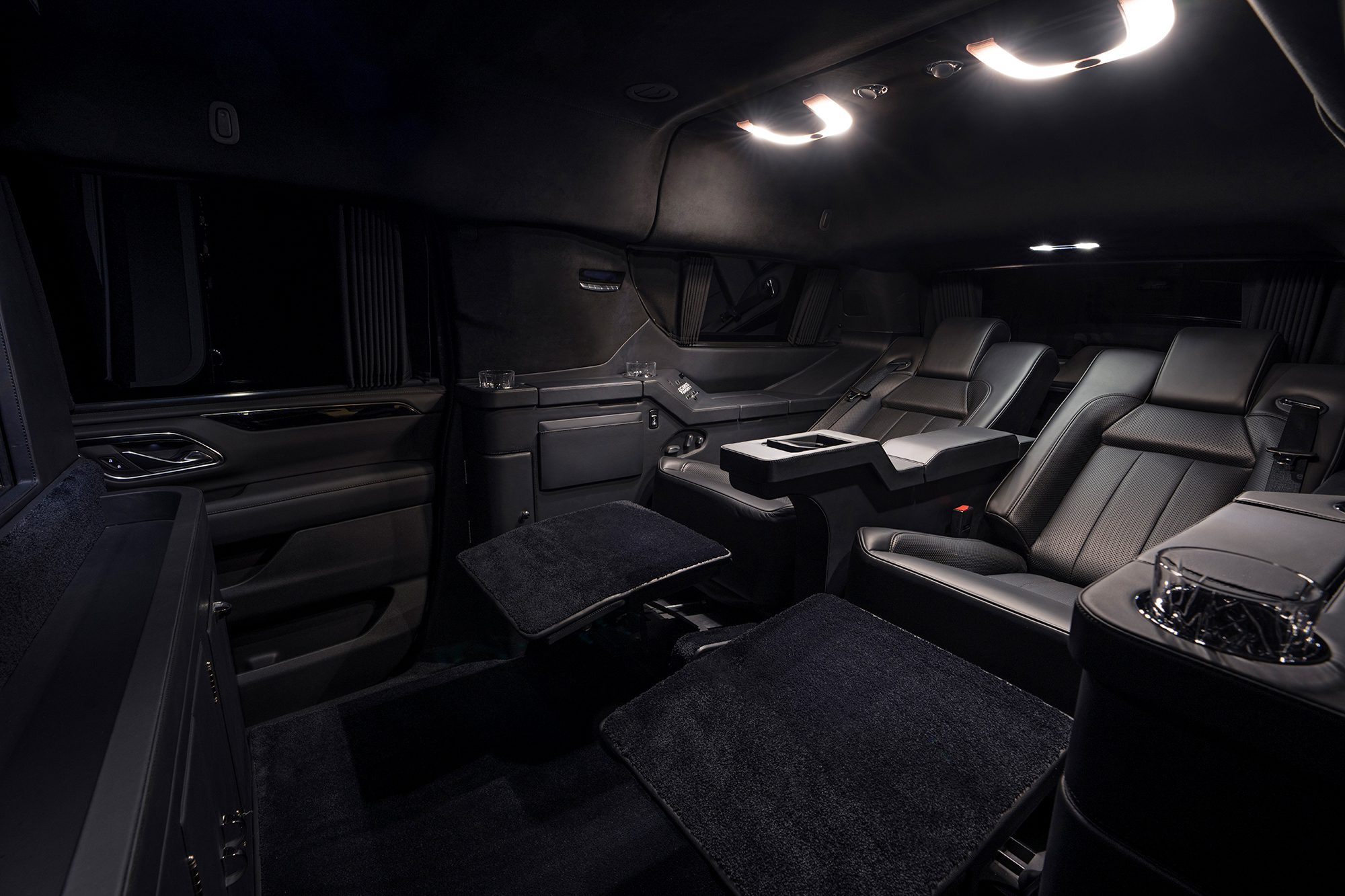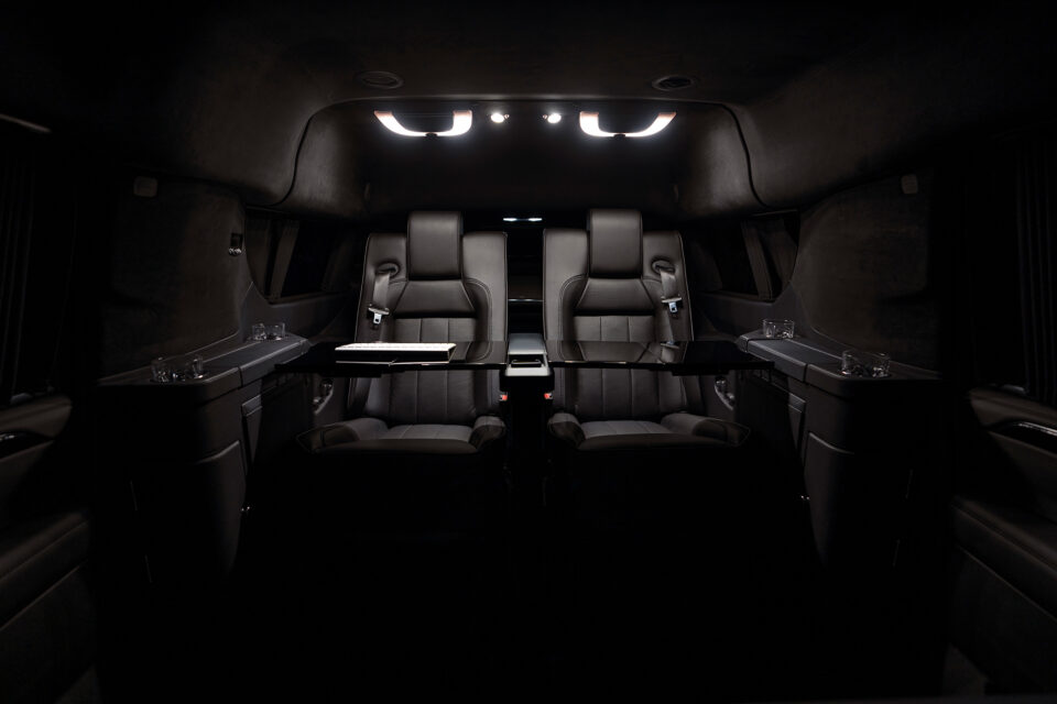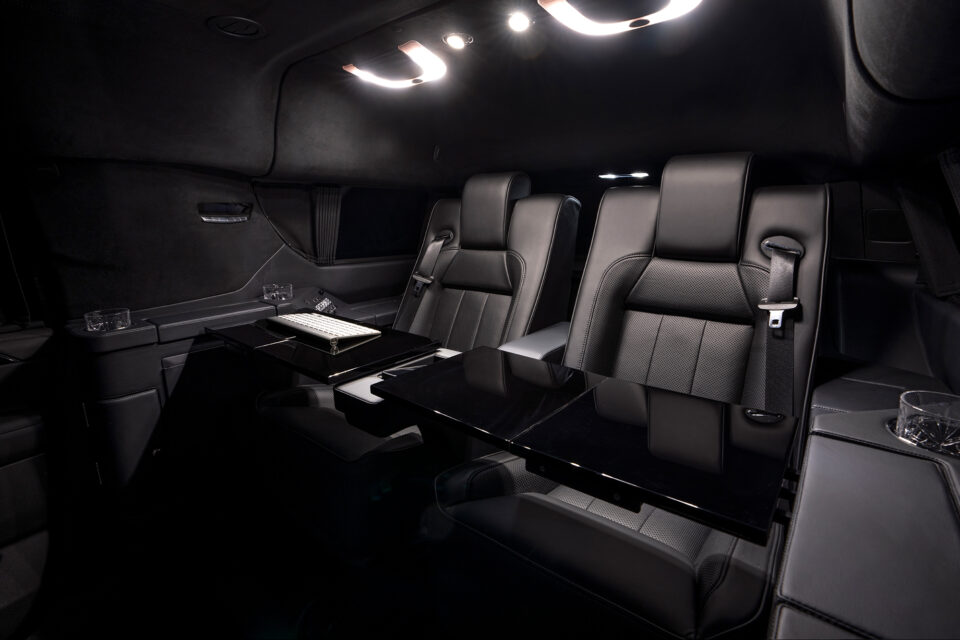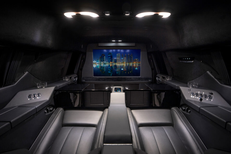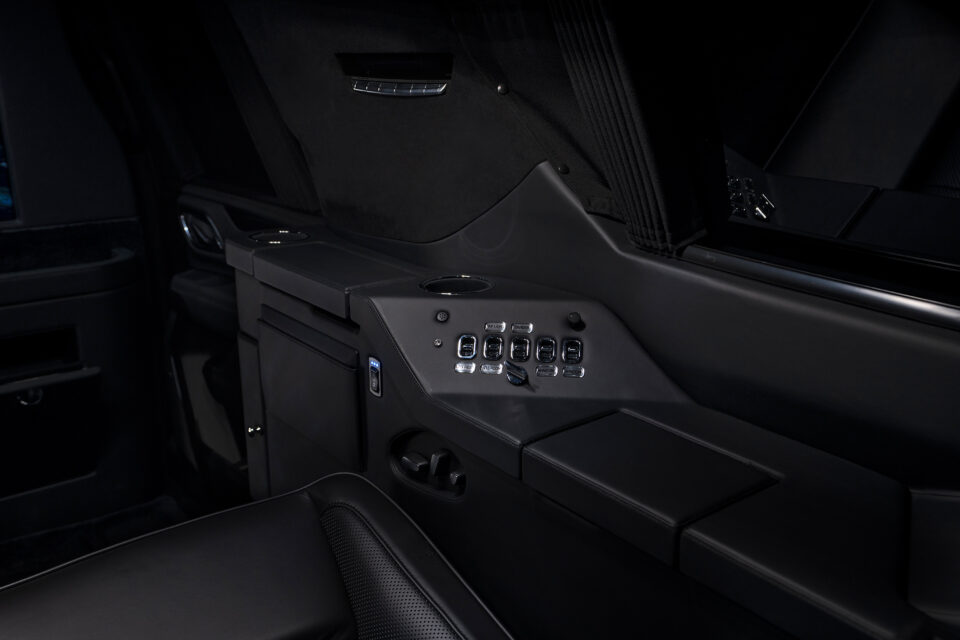 Rear cabin amenities include two aviation-style folding tables wrapped in genuine black piano wood veneer, a center console with integrated refrigerator, dedicated glassware storage, and precision-machined cup holders. A 43-inch Smart TV, mounted within a motorized privacy partition, anchors the rear entertainment and communications suite, paired with a Bose surround sound system for an immersive audio experience. Subtle, dimmable LED ambient lighting completes the environment, creating a refined and secure executive lounge on wheels.