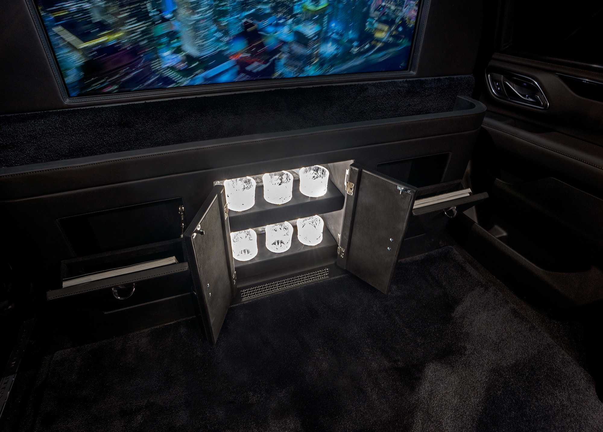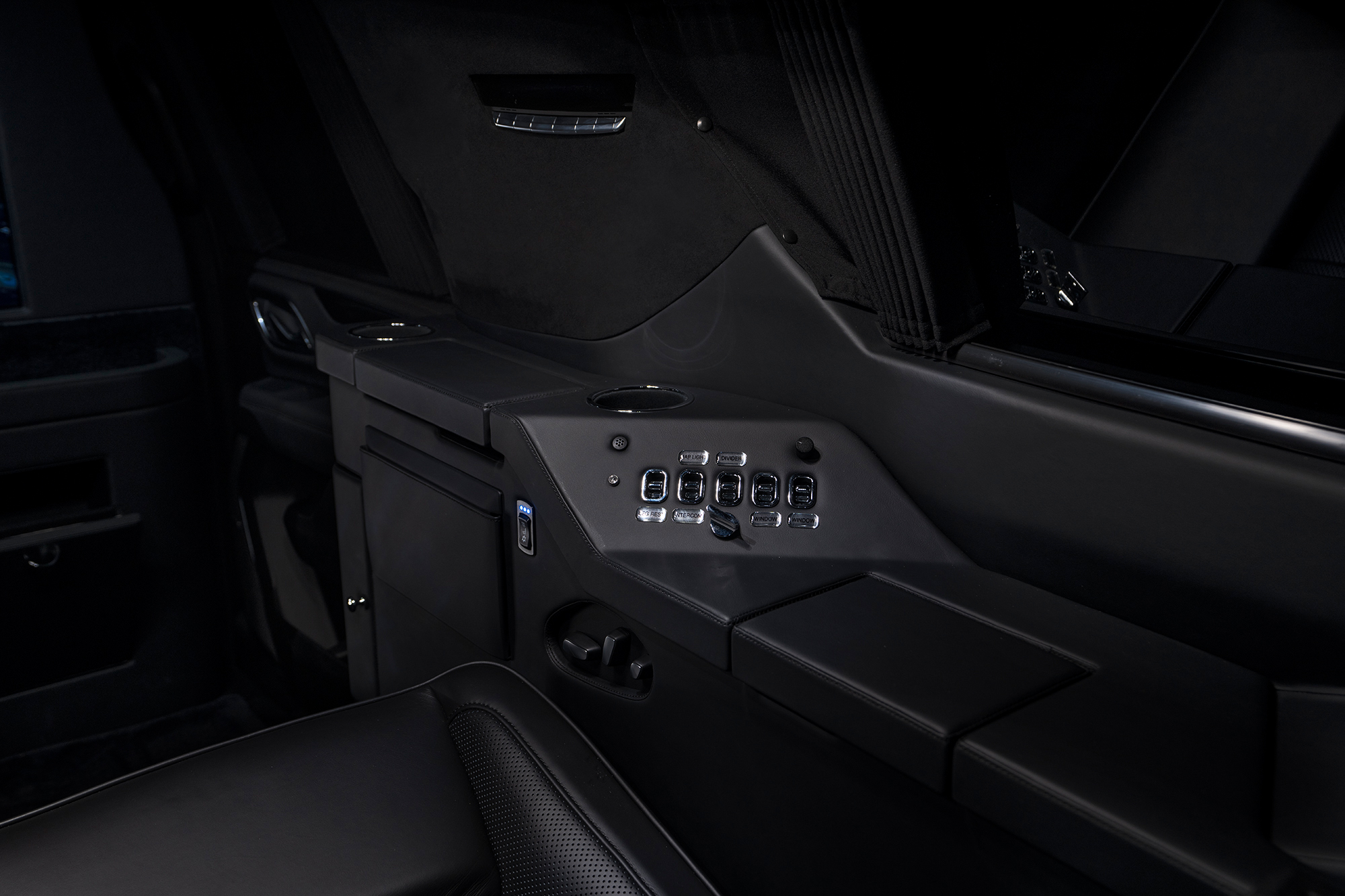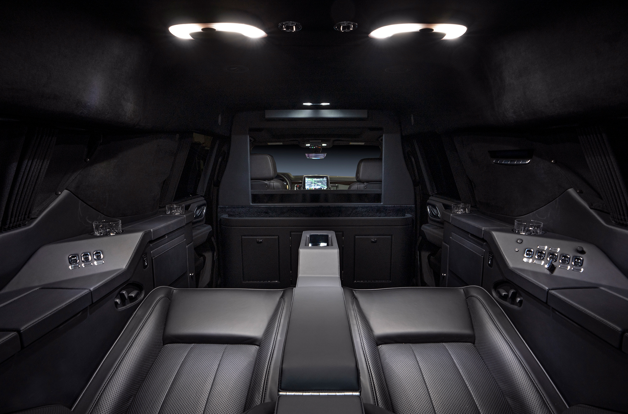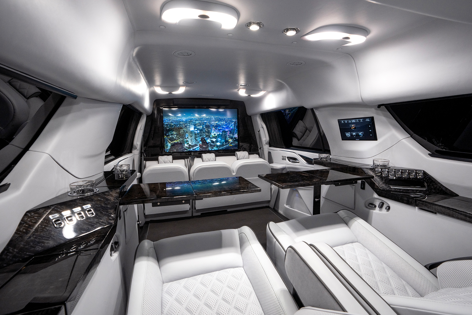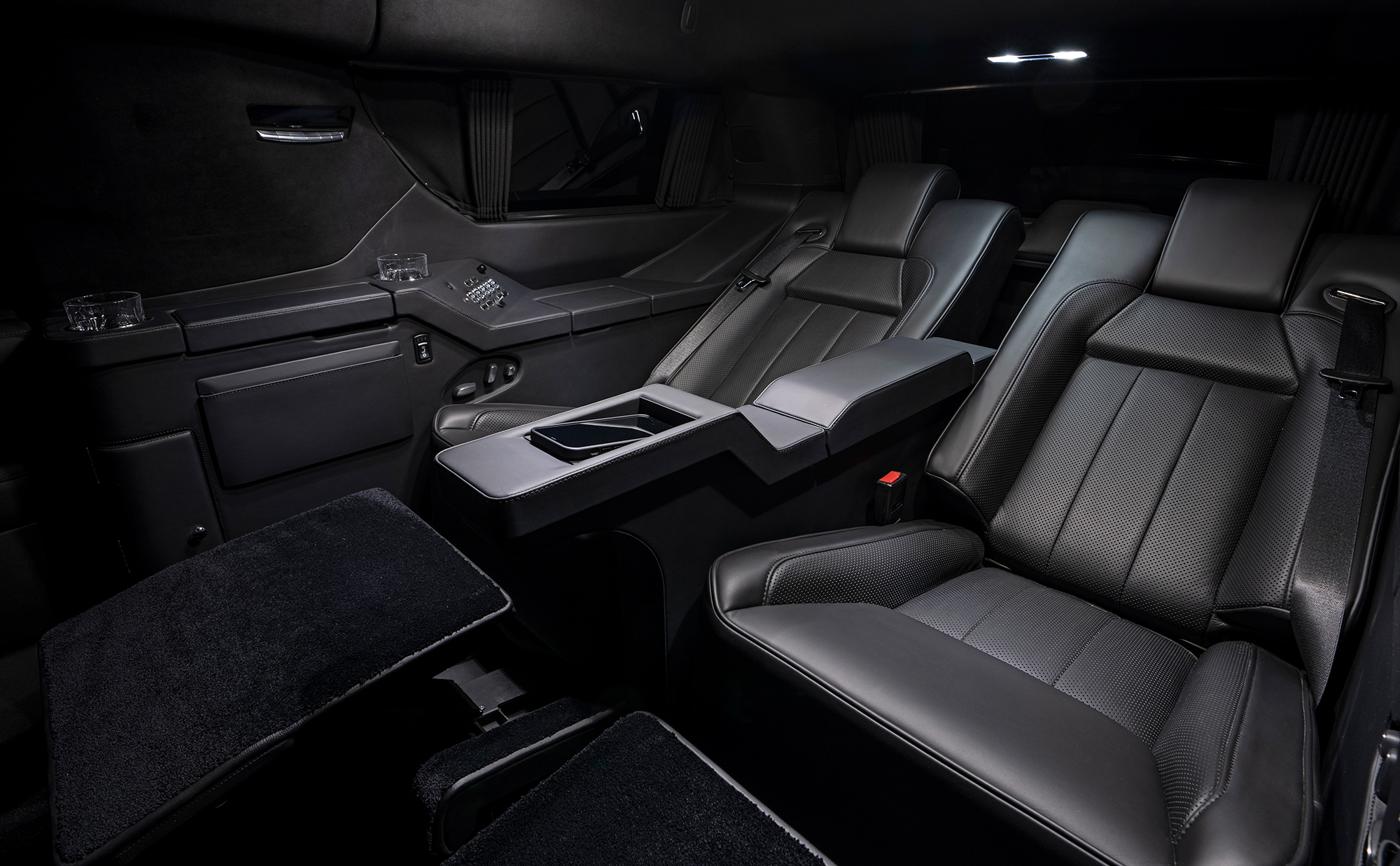 Rear cabin amenities include two aviation-style folding tables wrapped in genuine black piano wood veneer, a center console with integrated refrigerator, dedicated glassware storage, and precision-machined cup holders. A 43-inch Smart TV, mounted within a motorized privacy partition, anchors the rear entertainment and communications suite, paired with a Bose surround sound system for an immersive audio experience. Subtle, dimmable LED ambient lighting completes the environment, creating a refined and secure executive lounge on wheels.
