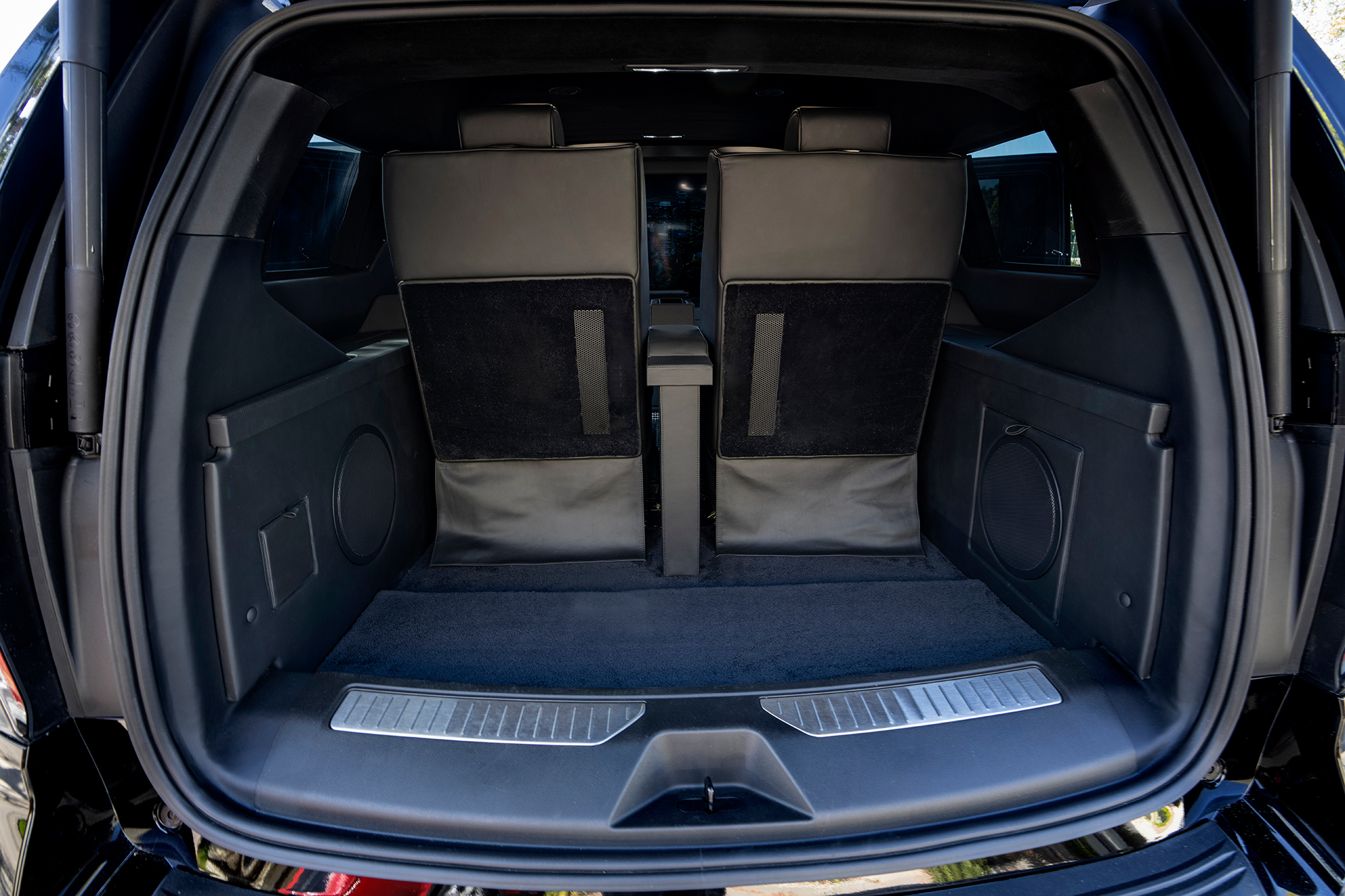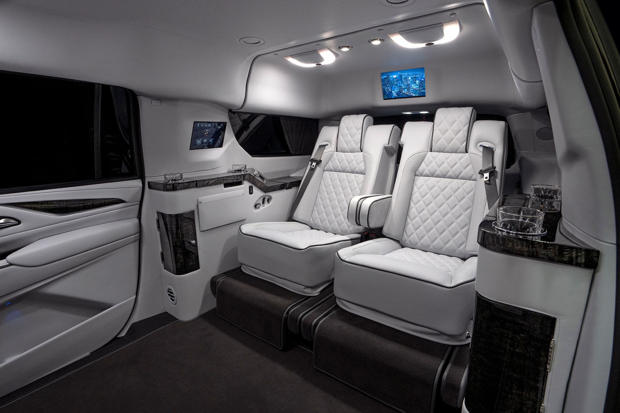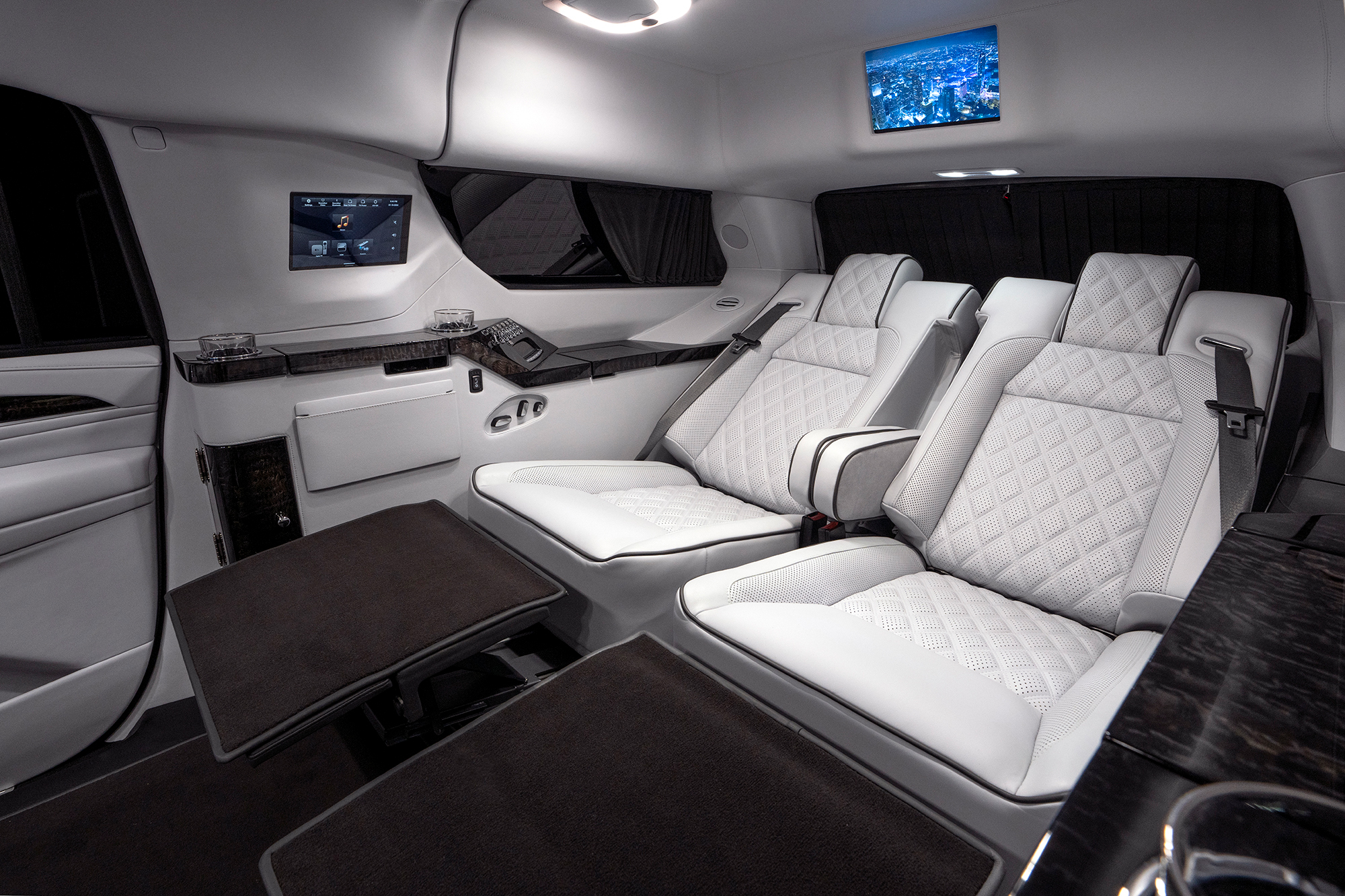 The rear cabin is appointed with custom Becker VIP seating, including two 6-way electric reclining bucket seats with extended electric leg rests. Each seat is upholstered in fine imported Italian leather and finished with elegant diamond-stitched detailing, delivering exceptional comfort. Complementing the seating are dual aviation-style folding work tables wrapped in genuine exotic Tamo wood veneer, offering both beauty and practical workspace.An electrically operated, rear-facing three-passenger seat folds seamlessly up or down, allowing unobstructed access, flexible seating configurations, and optimal viewing of the entertainment TV system. The advanced audiovisual suite features a Crestron touch screen controlled 43-inch LCD display mounted on a fully electric center divider partition, enabling viewing from the rear cabin or through the front windshield when deployed. An additional 12-inch rear monitor serves rear-facing passengers. Audio performance is delivered through a premium Bose soundbar and subwoofer surround sound system. Connectivity includes Apple TV, HDMI,USB-C, front and rear view cameras for seamless integration of business and entertainment needs.Purpose-built for productivity on the move, the Escalade is equipped with a high-end onboard mobile router paired with roof-mounted auxiliary antennas, ensuring a strong, reliable internet connection wherever business demands.
