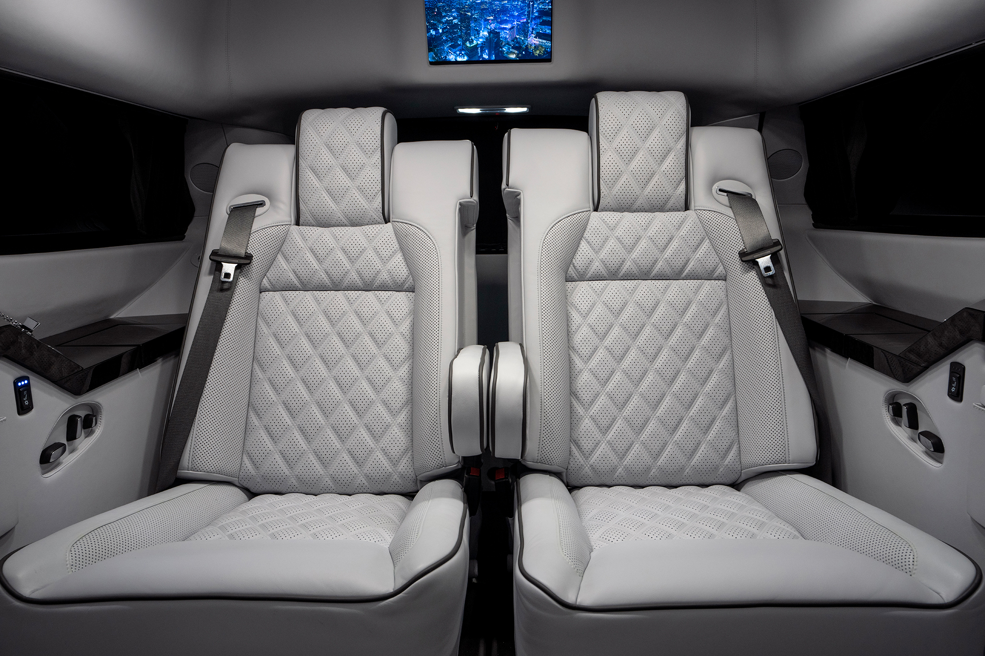 Ultra luxurious Becker JetVan with rear cabin seating for 4. Custom hand picked materials by the owner’s personal interior designer. Equipped with a custom rear facing center console with ample storage, A large LCD screen for rear passengers that opens up into the driver’s cabin for excellent viewing. A high-fidelity audio system with a fully automated Crestron touch control system. Aviation logic controlled electric window blinds. In house designed center row VIP sleeper bucket seats with large leg rests (perfect for napping while remaining safe in a 3 point seatbelt). Folding aviation style tables for forward and rear facing passengers.  Beautiful aviation grade interior lighting with dimmer. Ultra rich imported genuine leather coupled with in house genuine wood veneer throughout.
